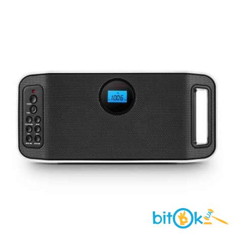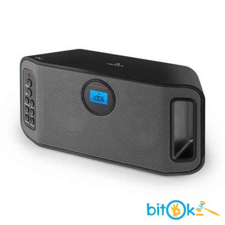 Удобный для форматов Bluetooth-динамик со встроенным FM-радио для использования дома и в пути. С подключением для USB-носителей, 20 предустановок станций, автосканирование и ответ на вызов или повторный набор. Корпус с мягким касанием со встроенной ручкой для переноски, синим ЖК-дисплеем и батареей.