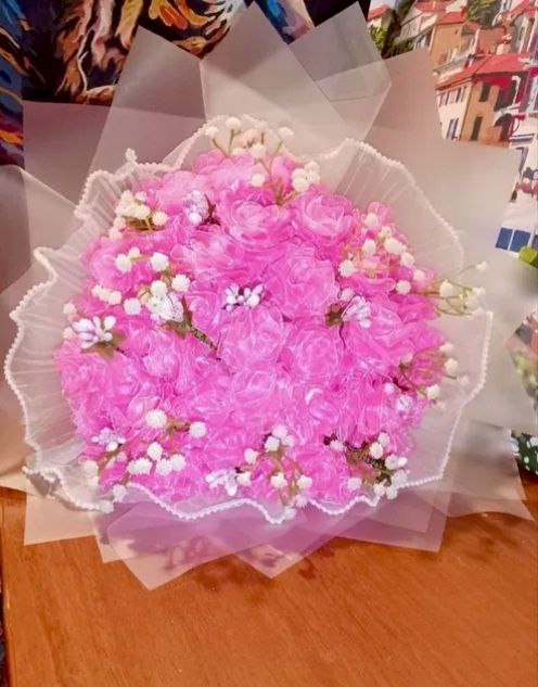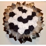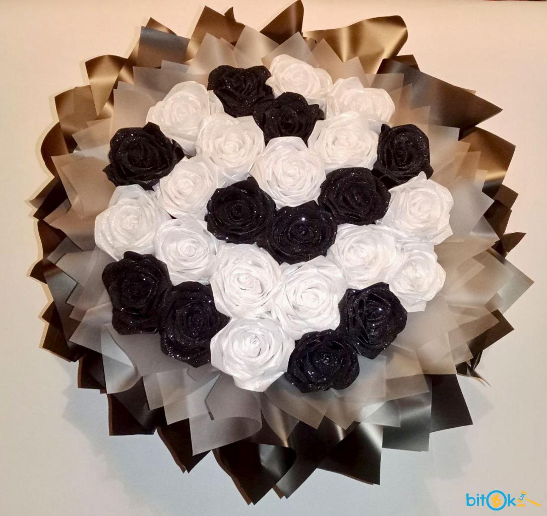 Композиція з 26 чорно-білих троянд ручної роботи з атласної стрічки, прикрашені блискітками.