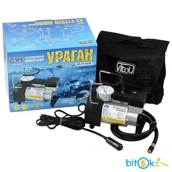 Автомобильный компрессор Vitol Ураган КА-У12030Компрессор автомобильный Vitol Ураган КА-У12030 - надежный и недорогой автомобильный компрессор для использования в автомобиле и в быту. Быстро накачает колесо легкового автомобиля, внедорожника и микроавтобуса. Пригодится для любителей активного времяпрепровождения при накачке инвентаря для спорта и отдыха. Автокомпрессор Vitol Ураган КА-У12030 оснащён мощным мотором продуктивность составляет 35 литров в минуту и надуть колесо 13-14 радиусов накачивает до 2 атмосфер за 2-3 минуты. Подключается данная модель через прикуриватель в комплекте идут переходники для подключения к аккумклятору . В комплекте имеется адаптеры для спортивного инвентаря и отдыха. Удобная тканевая сумка-чехол для транспортировки, с резиновыми вставками в основании для предотвращения скольжения в багажнике.ПреимуществаНадежный и простой в использованииМощный роторный моторВысокая продуктивность - 35 литров в минутуЗащитная система автоматического отключения питания при перегрузкеСумка-чехол для транспортировкиТехнические характеристикиМощность:150 ВтНапряжение:12 ВМаксимальный ток потребления:12 АМаксимальное давление:7 Атм (кг/см2)Количество поршней:однопоршневойПроизводительность:35 л/мин.Система защиты от перегрева:ЕстьДлина шнура питания:1 м.Длина шланга:2,7 м.Вес:2,40 кг.Гарантия 12 месяцев