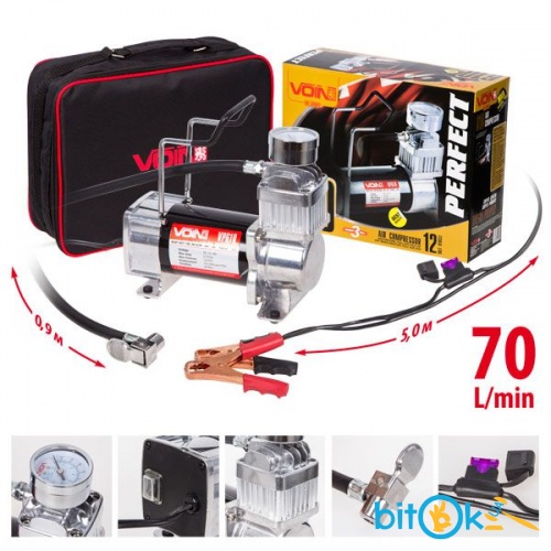 Автомобильный компрессор Voin VL-710Автомобильный компрессор Voin Limited VL-710 ориентирован на автомобилистов, которым нужен надежный, высокопроизводительный компрессор. Поршневая система увеличенного объема обеспечивают высокую производительность - время накачивания колеса 185/65/R14 от 0 до 2Атм составляет всего 55 секунд. Наличие большой и удобной ручки с мягким прорезиненным покрытием делает использование автокомпрессора комфортным как в теплое, так и в холодное время года. Модель автокомпрессора Voin VL-700 снабжена морозоустойчивым шлангом со встроенным дефлятором. Шнур питания оснащен плавким предохранителем, предотвращающим перегорание устройства. Наличие водостойкой сумки с отделением для шланга делает хранение автокомпрессора удобным и функциональным.ПреимуществаНаличие резиновых амортизаторов обеспечивают отличное шумо- и вибропоглощениеОснащен морозоустойчивым шлангом со встроенным дефляторомУдобная водонепроницаемая сумка для храненияТехнические характеристикиРекомендован для колес:R17+Мощность:500 ВТНапряжение:12 ВМаксимальный ток потребления:45 АМаксимальное давление:10 АтмКоличество поршней:однопоршневойПроизводительность:160 л/мин.Система защиты от перегрева:нетДлина шнура питания:2,5 мДлина шланга:8 мГарантия 12 месяцев