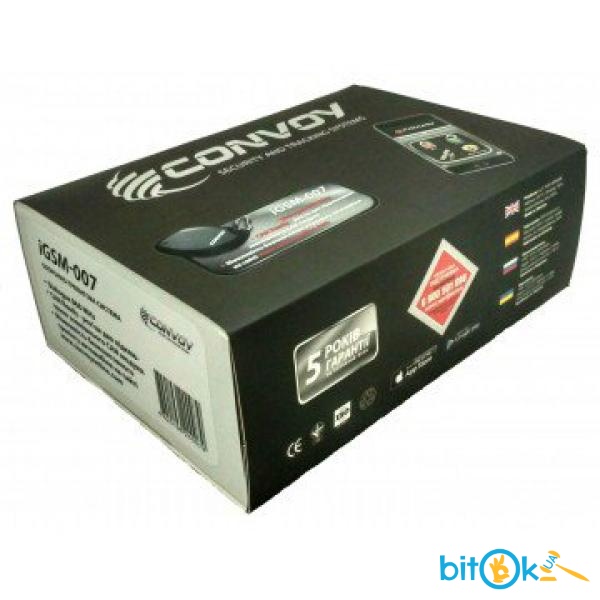 Автосигнализация Convoy iGSM-007 CAN ReadyConvoy iGSM-007 CAN Ready – автомобильная охранно-трекинговая система, которая позволяет информировать владельца охраняемого объекта без ограничения по расстоянию. GSM-система управляется при помощи штатного брелока автомобиля, диалоговой метки-транспондера, или при помощи телефона. iGSM-007 обеспечивает высокий уровень охраны автомобиля, а также мониторинг местоположения объекта охраны без абонплаты.Система имеет разъем в блоке управления для подключения и программирования внешнего протокольного адаптера шины CAN (CAN Ready). Используя протокольные адаптеры шины CAN (Convoy UniCAN-420 и Convoy CANTEC-F2), система быстро устанавливается (plug and play) на автомобили с CAN-шинами и может автоматически определять более 200 моделей автомобилей.Кроме возможности подключения адаптера шины CAN, в комплектации системы iGSM-007 CAN Ready входят 2 активные метки с диалоговым кодированием сигнала, работающие на частоте 868 MHz. Благодаря уникальному протоколу обмена между меткой и блоком управления GSM-системы обеспечивается высокая помехозащищенность сигнала, а также невозможность электронного взлома системы методом ретрансляции.Режимы GSM-системы с добавлением метки:Режим «Свободные руки» («HANDS FREE») используется для постановки/снятия с охраны и открытия/закрытия центрального замка автомобиля без использования брелока автомобиля.Режим постановки/снятия с охраны системы без управления центрального замка автомобиля.Функция кнопки подтверждения снятия системы с охраны.В метках реализованы:световая индикация текущего режима метки;световая индикация количества запрограммированных в систему меток;программирование неограниченного количества меток в систему;световое и SMS-оповещение о разряде батареи метки;возможность настройки чувствительности (дальности обнаружения) метки;настройка функций метки с помощью программного приложения «SMS-генератор» для ОС Android.Используя GSM-сеть данная охранная система реализует оповещение владельца о событиях на охраняемом объекте (в автомобиле), дистанционно блокирует двигатель угоняемого автомобиля, а также управляет всевозможными сервисными устройствами автомобиля.Convoy iGSM-007 CAN Ready информирует автовладельца как SMS-сообщением с описанием тревожного события, так и прямым звонком, во время которого голосом будет сообщена причина тревоги. Можно использовать до 5-ти разных номеров телефонов, на которые будут отправляться SMS-сообщения или производиться дозвон по тревожным событиям. Сигнализация постоянно контролирует уровень сигнала для связи ее с телефоном.Для того, чтобы управлять системой с помощью SMS-сообщений на мобильных телефонах с сенсорным экраном, работающих на платформах Apple Iphone и Google Android, необходимо иметь специальную прикладную программу управления (для смартфонов iPhone приложение можно бесплатно скачать на iTunes Store, введя в строку поиска «Convoy GSM». Для смартфонов на платформе Android (версия 2. 1 и выше) приложение доступно в Google Play). Приложение существенно упрощает использование данной охранной системы, которая по мимо автомобилей, может устанавливаться на различные объекты охраны: квартиры, коттеджи, гаражи и т. д. Она позволяет автовладельцу дистанционно ставить и снимать охрану объекта, управлять сервисными устройствами, осуществлять пуск и остановку двигателя автомобиля, управлять несколькими система
