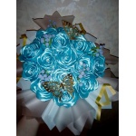 Квіткова композиція з 15голубих троянд з атласної стрічки у білій коробці.