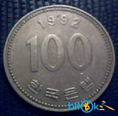 Монета с номиналом 100. 1992. Корея. Из металла белого цвета.