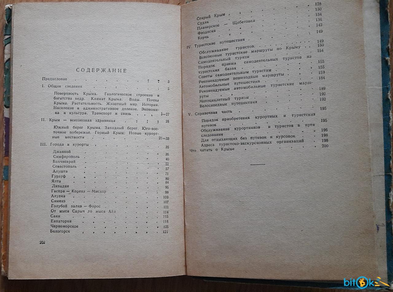 Опис: Видання п'яте, переглянуте та доповнене. Довідник-путівник має на меті дати приїжджим короткі відомості з географії, історії, народного господарства, культурного будівництва, довідки про міста, курорти, пам'ятки природи, історичні місця та пам'ятки, транспорт та побутове обслуговування. Путівник містить вказівки про найцікавіші екскурсії та туристичні подорожі Кримом, не тільки пішохідних, а й автомобільних, мотоциклетних та велосипедних. Довідник містить відомості про порядок придбання курортних та туристичних путівок, обслуговування курортників та туристів у дорозі, поради для відпочиваючих без путівок та курсівок. Опис супроводжується чорно-білими ілюстраціями: фотографіями, картами, схемами. Формат 11,5 х 17 см.