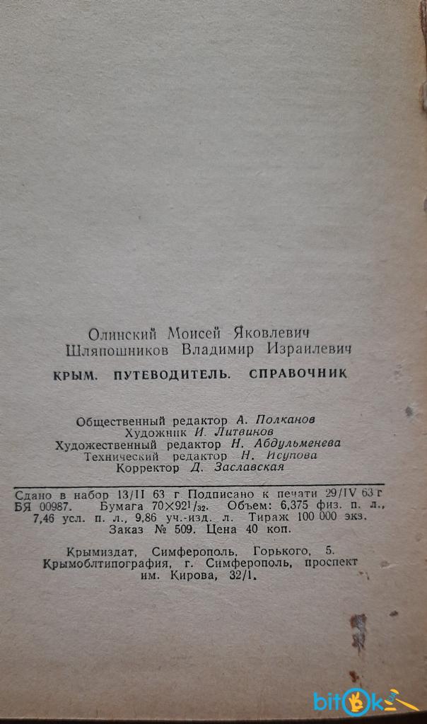 Олінський М. Я., Шляпошников В. І. Крим. Путівник. Довідник (російською мовою) Сімферополь: Кримвидав. 1963р. 204с., тверда обкладинка.