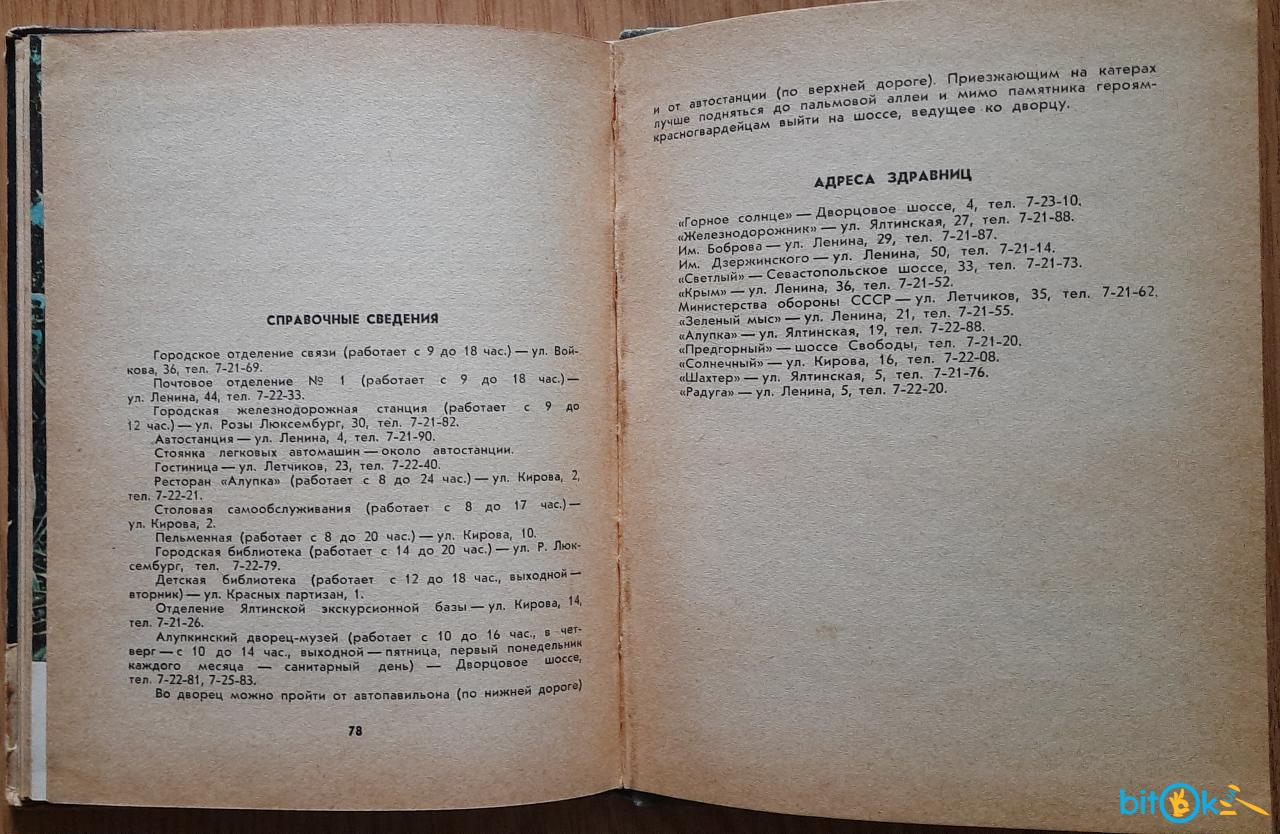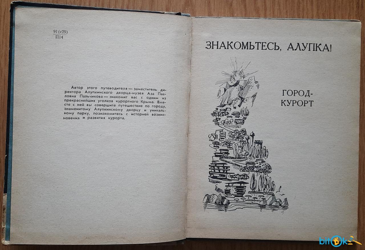Пальчикова А. П. Алупка. Нарис-путівник. Місто-курорт. Палац-музей. Парк. ( Російською мовою) Видавництво: Крим 1965р. 80 с. + 6 вкл. кол. Фото Художники М. Каневський та О. Тираж 70000