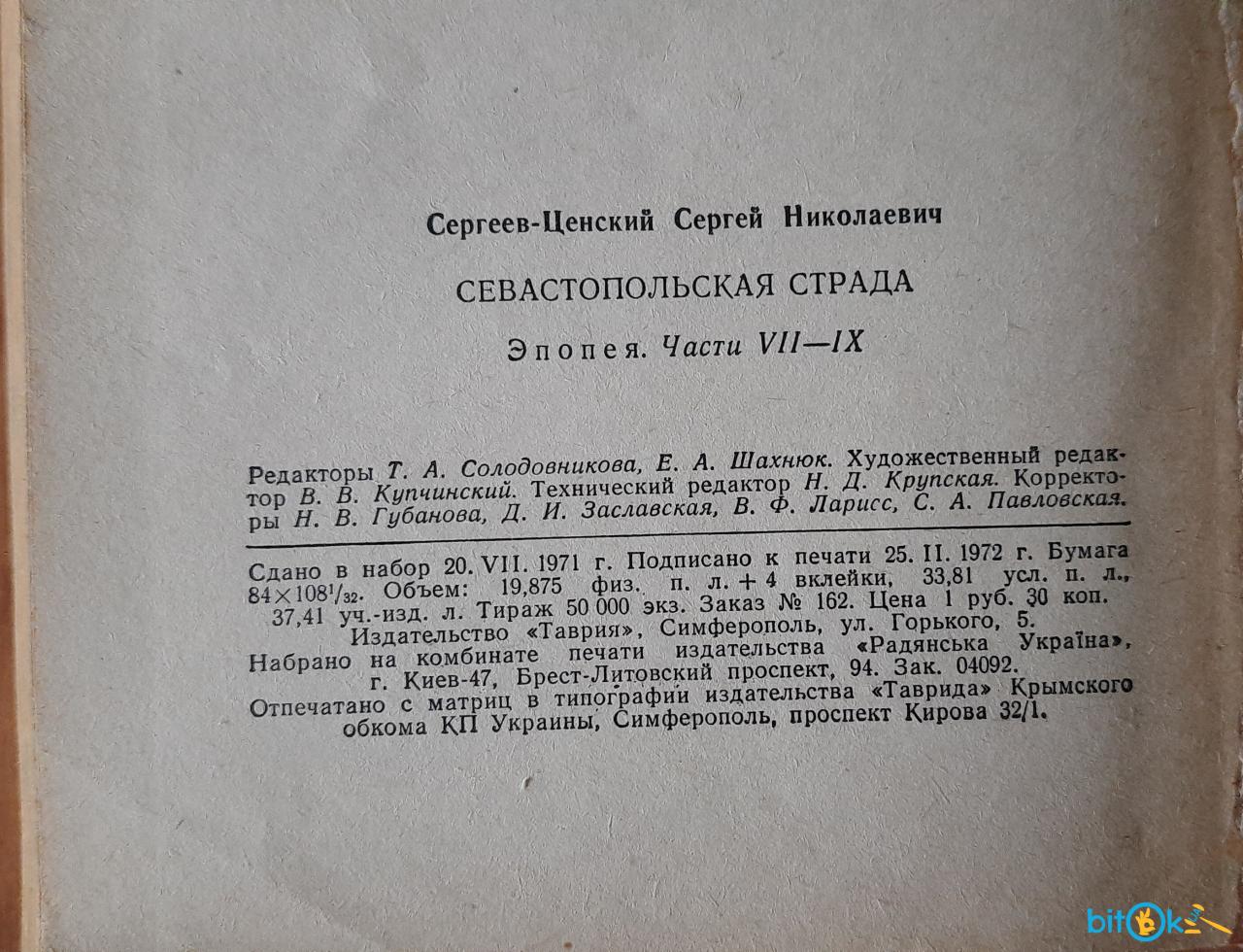 Видання 1979 року видавництва «Таврія» (Сімферополь). Тверда палітурка. Це історична епопея про період героїчної оборони Севастополя під час Кримської війни 1854-1855 років.