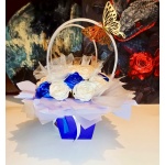 Квіти розміщені у синій подарунковій сумочці з метеликом, між трояндами додано блискучий фатин.