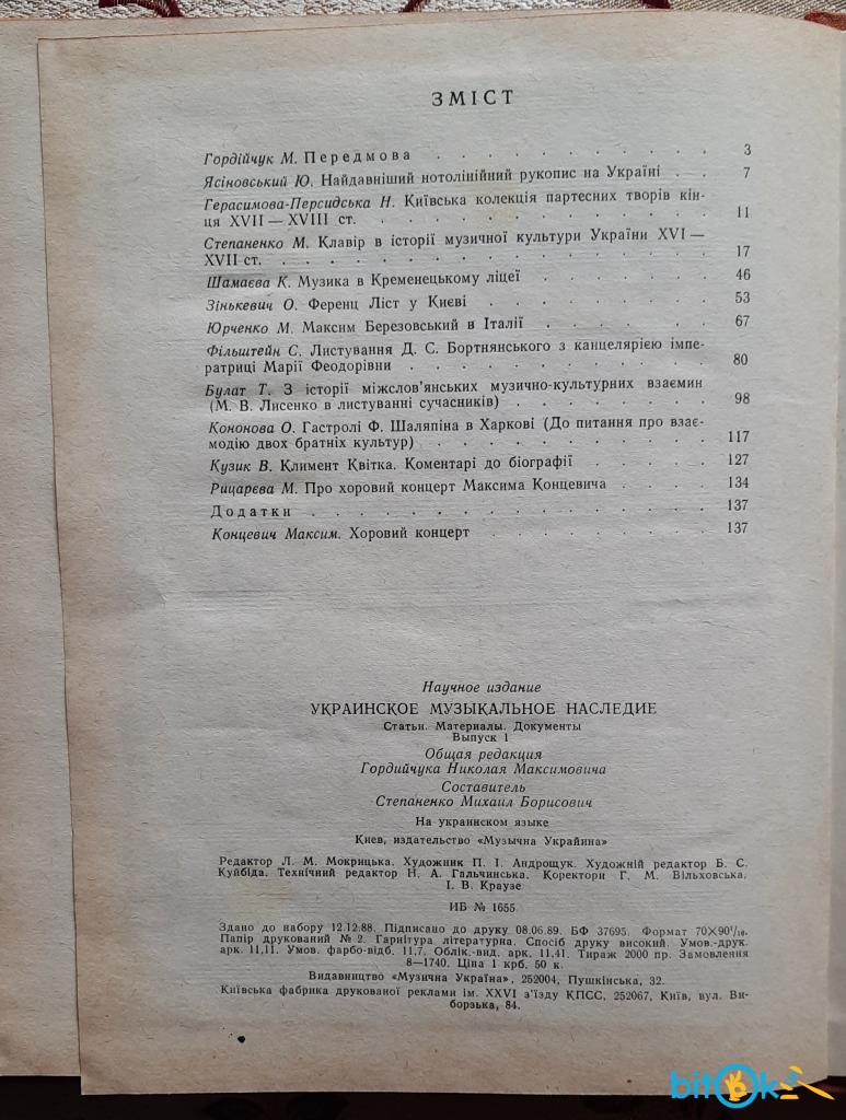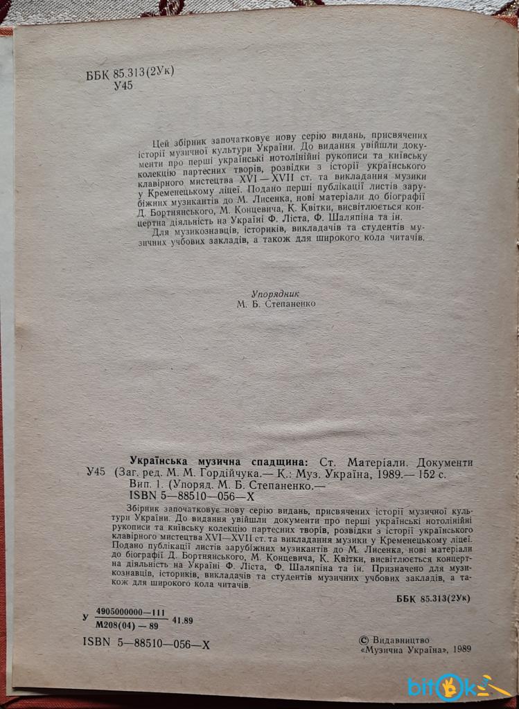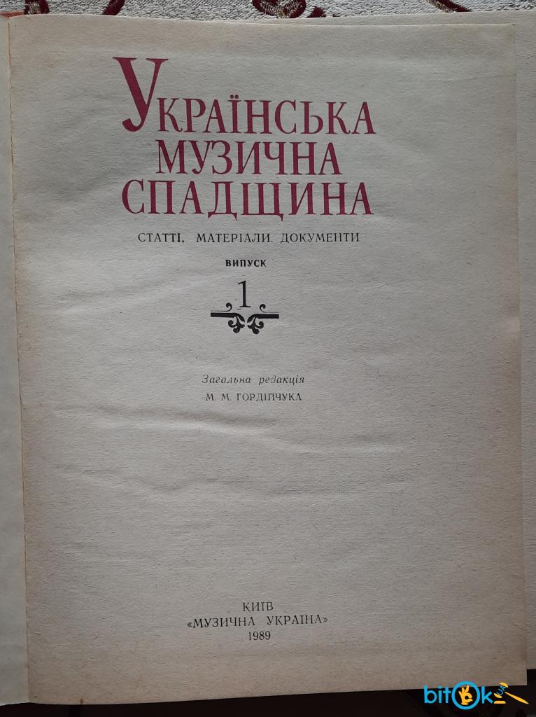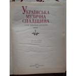 Українська музична спадщина: статті, матеріали, документи, випуск 1, загальна редакція М.М. Гордійчука, наукове видання, Київ: Музична Україна, 1989, 152 стор. Зміст див на фото Тираж 2000