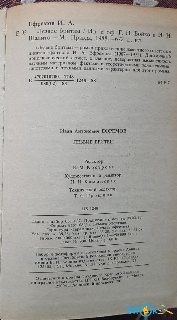 Іван Єфремов. Лезо Бритви, (осійською мовою) Москва: Правда, 1988, на титулі є дарчий надпис